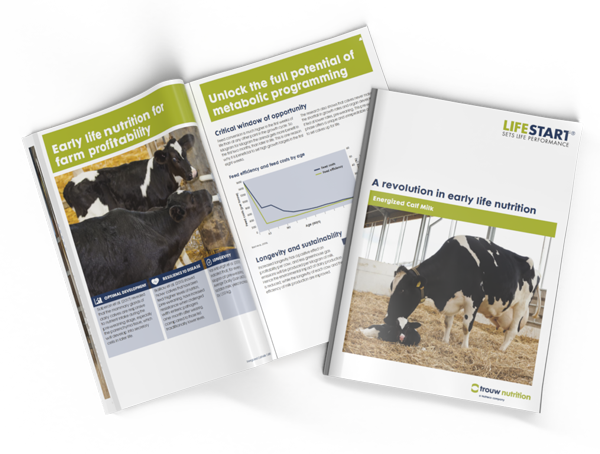 Preweaning daily weight gain of a calf has been shown to have a significant impact on heifer milk production during the first lactation. This effect on dairy heifer first lactation has been demonstrated via numerous trials in recent years. The effect on the preweaning daily gain of calves as well as the effect on milk production in the first lactation of heifers varied between these trials. A trial carried out at the Trouw Nutrition Ruminant Research Centre “Kempenshof” showed that a LifeStart feeding schedule during the first eight weeks of life resulted in a higher milk yield, a higher milk fat yield and a higher feed intake in heifers during their first lactation (See figures 1 to 3).
